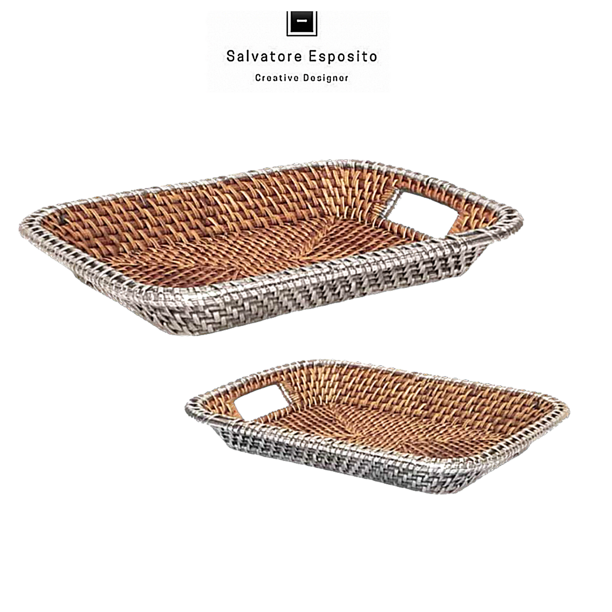 Vassoio rettangolare con manici in rattan ed argento